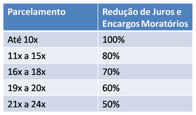 Na redação final do projeto, as faixas e condições de parcelamentos ficaram da seguinte forma: pagamento parcelado em até 10 vezes com isenção total de juros e encargos moratórios; parcelamento de 11 até 15 vezes com desconto de 80% nos juros e encargos; parcelamento de 16 até 18 vezes com redução de 70%. Para parcelar os débitos em 19 ou 20 vezes, o desconto nos juros e encargos chega a 60% e para acordos de 21 a 24 vezes, o desconto de juros e encargos é de 50%.